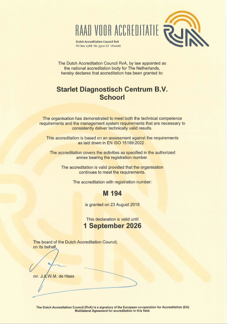 Starlet diagnostisch centrum is geaccrediteerd door Raad voor Accreditatie. Deze organisatie bevordert de kwaliteit van het laboratoriumonderzoek en verzorgt de accreditatie van laboratoria in de gezondheidszorg. In september 2022 is de accreditatie van Starlet dc verlengd tot 1 september 2026.